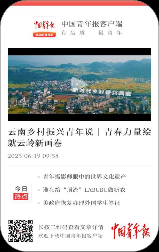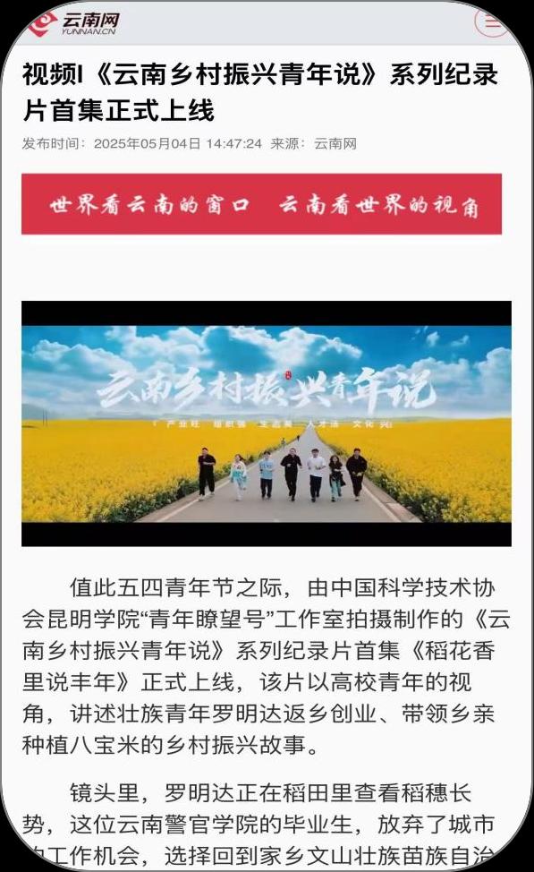 创作团队创新采用“故事化叙事+可视化呈现”方式,将乡村振兴政策话语转化为青年话语体系,以5位高校青年学子为出镜讲述人,讲述云南乡村振兴青年典型的人物故事,构建起观察云南乡村振兴的青春视角。该片不仅成为记录边疆民族地区乡村振兴实践的影像档案,更有效激发高校学子投身乡村振兴的热情,为云南高质量推进乡村振兴战略汇聚高校青年智慧与创新动能。