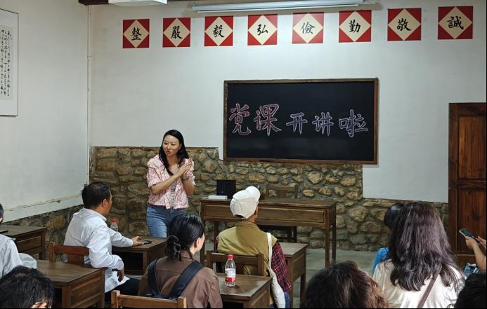 在遗址现场,学院党委书记王海艳以“红色基因赋能育人实践”为主题讲授党课,结合革命历史与学院教育教学实际,引导师生党员思考如何将红色精神融入日常教学与学习,以初心使命扛起育人责任。党课结束后,全体师生党员面向党旗庄严站立,高举右拳重温入党誓词,铮铮誓言回荡在革命遗址上空,进一步坚定了为党育人、为国育才的理想信念。