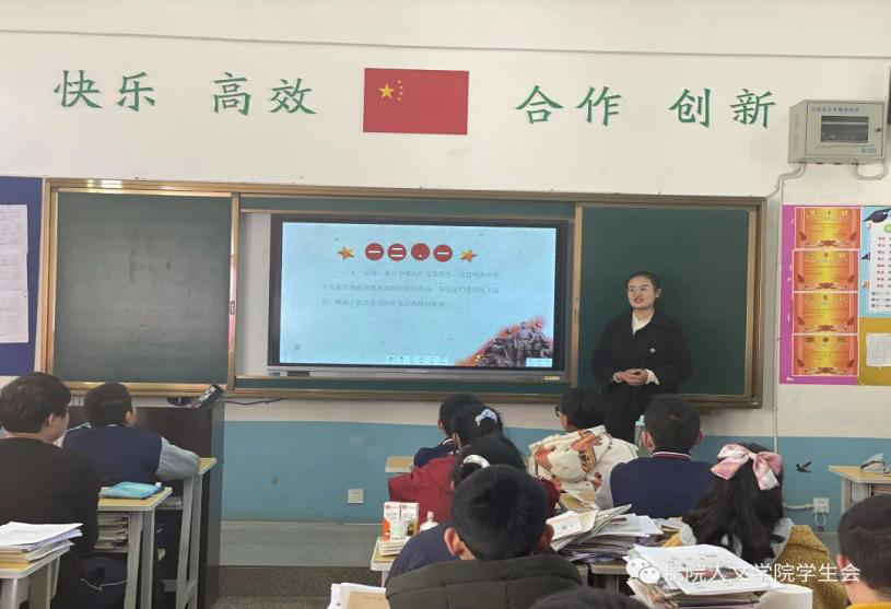 2018级历史兼中文1班杨彩芸同学作为本次的主讲人之一,以“忆峥嵘岁月,缅少年英烈”为主题,向附属经开学校初二年级的同学们讲述了云南“一·二一”运动中年仅16岁的少年英烈张华昌,为祖国的民主事业抛头颅洒热血壮烈牺牲的故事,16岁正值花季的少年,在国难当头之时选择捐躯赴国难,把爱国之志化为报国之行。一寸山河一寸血,透过历史的尘烟,云南这片土地上有诸多英雄故事,有数不清的红色记忆,英雄虽逝,精神长存。这不禁使人联想到百年前的春天,面对苍老、守旧,磨难重重的旧中国,梁启超先生振臂高呼,救亡图存,改革自强,复兴中国,时不我待。由衷地期盼着勃勃英姿的少年中国的出现,对少年中国的明天充满憧憬、期望,把复兴中国的厚望,寄予在未来中国少年的身上......