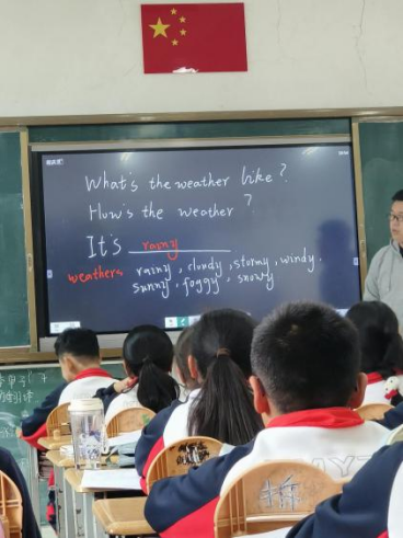 本节课主要学习现在进行时和过去式以及天气描述和提问方式,老师结合实际,让学生们根据学到的句子观察身边的环境开始应用起来。比如当天是雨天,老师就通过it is rainy