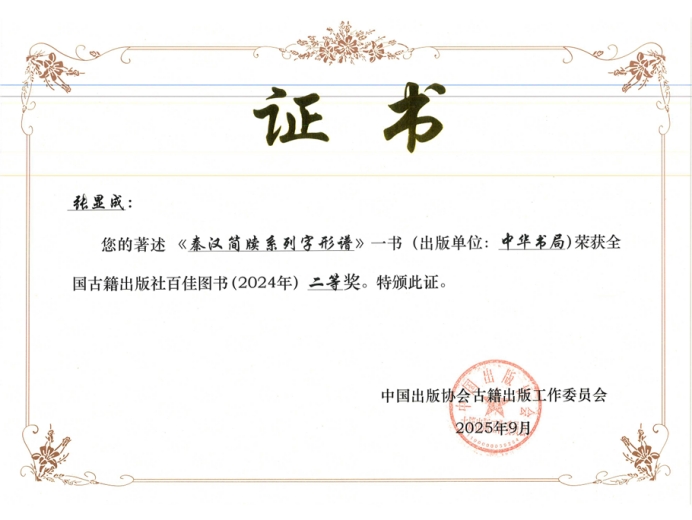 张显成教授《秦汉简牍系列字形谱》荣获全国古籍出版社百佳图书二等奖
