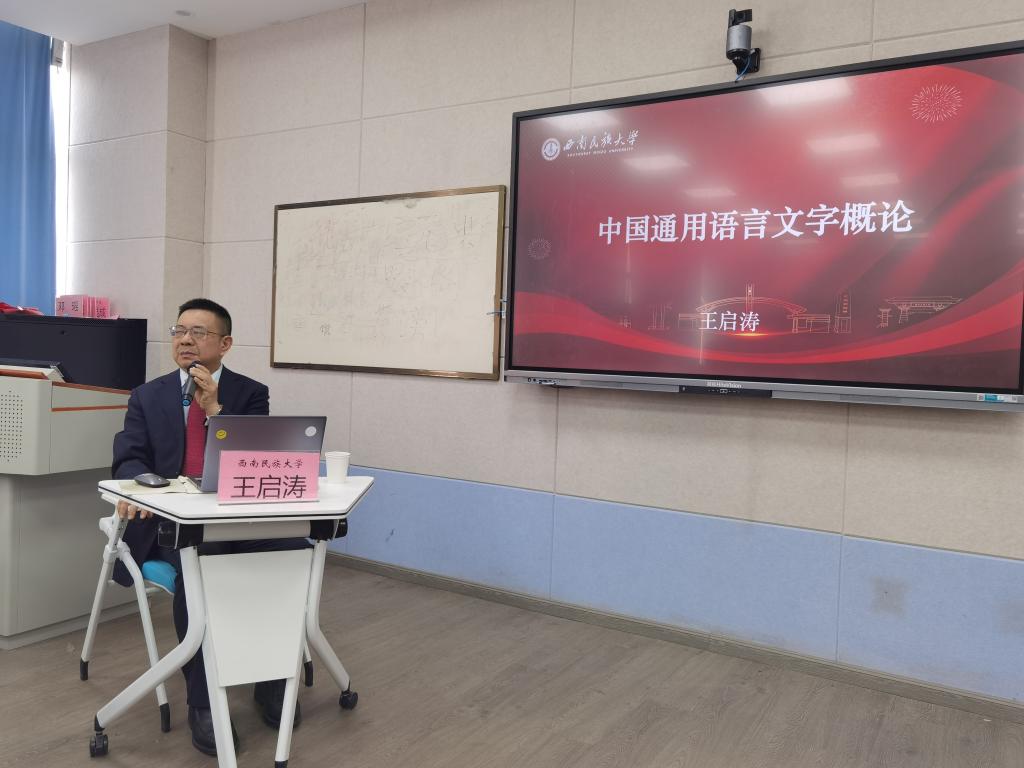 2026年3月5日,我院特邀西南民族大学资深教授王启涛做《中国通用语言文字概论》主题学术讲座。讲座中,王教授指出中国通用语言文字是中国国家统一、民族团结、经济发展、社会和谐、国际形象的象征,是各民族长期交往交流交融的结果与各族人民共同的历史选择。王教授系统阐释了中国通用语言文字六大核心要义,并结合文献理论与生动个案解读中国通用语言文字在传承中华优秀传统文化、铸牢中华民族共同体意识、建设中华民族共同体中的核心作用,内容兼具学术性与实用性。王启涛教授还专门与我院谢士华教授就《燕行录》研究、同何姣副教授就哀牢山文书研究等问题进行了交流探索,鼓励我院师生依托国家级国家通用语言文字推广基地,深入学习贯彻即将颁布的《中华人民共和国民族团结进步促进法》,持续开展特色研究,为中国通用语言文字研究推广与民族团结进步做出更多更大成绩。
