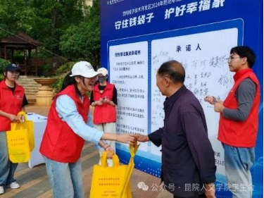 活动当日,人文学院学生志愿者主动参与活动现场布置,向现场群众讲解非法集资的危害,提醒广大群众要提高法治意识、增强防范意识,切莫贪图所谓“高额回报”,自觉远离、抵制并积极举报各类非法集资行为。随后又为社区居民分发防范非法集资宣传册、协助社区工作人员开展趣味游戏并组织奖品发放。在活动过程中,人文学院学生志愿者始终以严谨认真的工作态度完成任务,彰显青年风采,为社区发展贡献青春力量。
