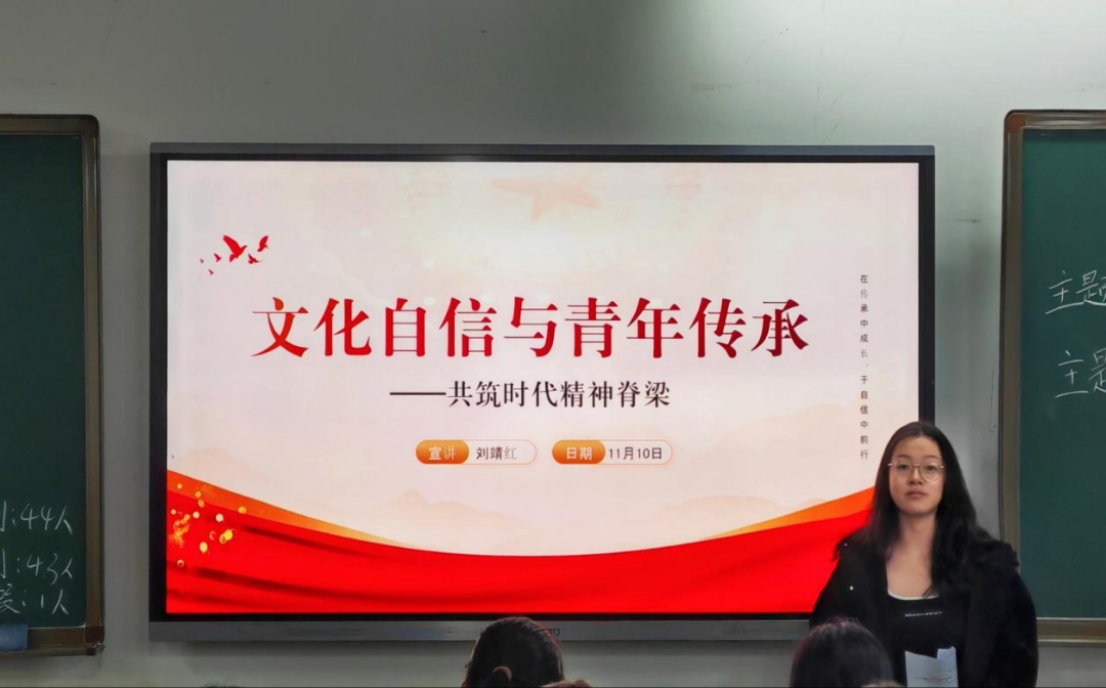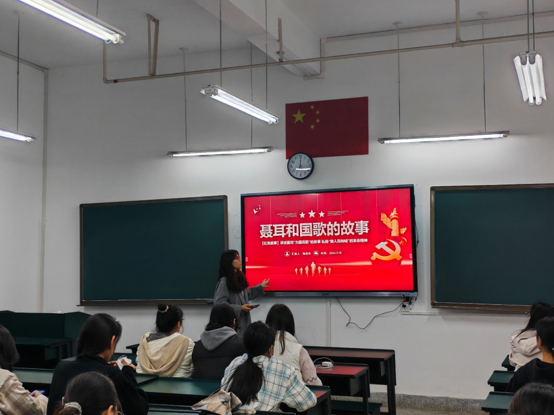 10月31日,赵雪同学在博雅楼1204教室开展了以“以吾辈之青春,捍盛世之中华”为主题的宣讲活动,同学们对“以吾辈之青春,捍盛世之中华”的深刻内涵有了更加清晰的认识。作为新时代青年,我们深感肩负时代重任,誓言将宣讲中所汲取的智慧与力量转化为实际行动,为实现中华民族伟大复兴的中国梦不懈奋斗,贡献自己的青春力量。 11月10日,人文学院宣讲团成员陶茜冉同学在博雅楼1223教室开展了以“红色教育”为主题的宣讲活动,在本次活动中介绍了聂耳与国歌的故事,让同学们了解到革命精神的伟大,不仅丰富了同学们的知识体系,也为同学们带来了宝贵的学习机会,为推动社会主义事业的发展贡献力量。同日晚,青年讲师团成员刘靖红同学在博雅楼1207教室开展了以“文化自信与青年传承——共筑时代精神脊梁”为主题的宣讲活动,刘靖红深入浅出地讲解让同学们深刻认识到文化传承与创新的重要性,激励大家在今后的学习生活中积极担当文化传承使命,争做新时代有文化自信的优秀青年,为共筑时代精神脊梁贡献力量。