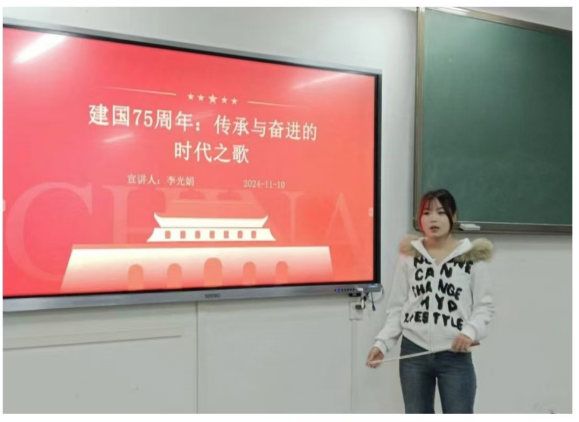 10月25日,陈思彤同学和姜峄琳同学在惟真楼1402开展宣讲,陈思彤的主题是“讲好‘聂耳和国歌的故事’”,通过讲述聂耳精神的内涵与国歌创作背后的故事,带领同学们从聂耳身上汲取精神力量,激励传承和弘扬聂耳精神,为实现中华民族伟大复兴提供不竭的精神动力。姜峄琳的宣讲主题为“党的二十届三中全会精神”,向同学们讲述了新时代以来全面深化改革的成功实践和伟大成就,深入学习进一步全面深化改革的总目标是继续完善和发展中国特色社会主义制度,推进国家治理体系和治理能力现代化。