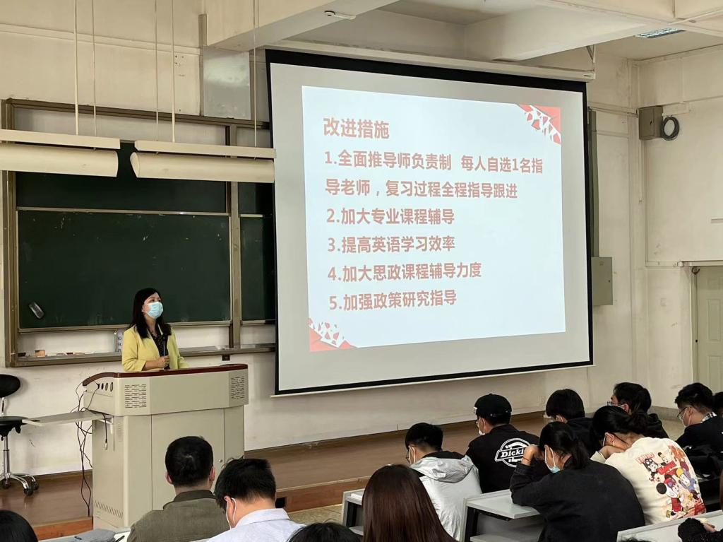 邓瑶院长向同学们介绍了学院考研工作的组织安排。对于考研的同学,学院将全方位进行支持,给同学们提供所需要的帮助。邓瑶院长也积极鼓励同学们努力拼搏。学院为同学们的考研指导提供了以下措施:第一,全面推进导师负责制,复习过程全程跟进指导。第二,加大专业课程辅导。第三,提高英语学习效率。第四,加大思政课程辅导力度。第五,加强政策研究指导。