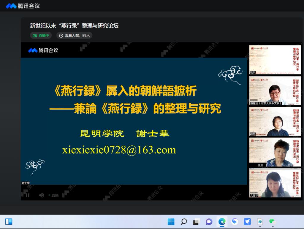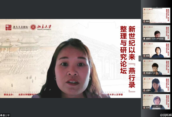 本次论坛由北京大学朝鲜半岛研究中心、北京大学中国古典学平台、北京大学东方文学研究中心、北京人文学部联合主办,汇聚了“燕行录”研究界众多重量级的专家,有来自北京大学、北京师范大学、北京外国语大学、中国社会科学院等10多所著名高校、科研机构的教授,也有来自延边大学《东疆学刊》、国家图书馆《文献》编辑部、北京大学出版社的主编或编审,论坛还邀请了《光明日报》《中华读书报》等新闻媒体,是一次名副其实的高端前沿论坛。受北京疫情形势影响,本次论坛采用线上(腾讯会议)的方式进行。谢士华老师从事《燕行录》的词汇研究已有十年之久,她在论坛上提出:“整理点校《燕行录》时,要格外留意其中可能存在的朝鲜语成分。只有这样才可能准确的理解文本,并在此基础上有效地展开其他相关的研究工作。”该观点得到与会专家的一致认可和高度评价。