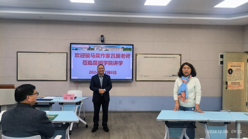 吕翼是中国作家协会会员、“云岭英才.文化名家”、第十二届骏马奖获奖作家,近二十年来创作、出版、发表散文、小说数十部,百余万字;作品题材丰富多样,深情书写、生动展现家国情怀。吕翼写作经历丰富,在陈代明老师引领下,发表第一篇作品《得到的和失去的》,以《雨滴乌蒙》强化基本功,创作了《土脉》《疼痛的龙头山》《生为兄弟》等作品。在讲座中,吕翼老师详细介绍了《肝胆记》的创作历程。从《冤家的鞋子》开始,《肝胆记》逐步成长起来,历经曲折终出版,展现民族大义与爱国情怀。他注重从生活、民族民间和地方文献获取素材,主张多读书且要读透书、能写通、追求差异化。讲座最后,他以“苦学酬身世,佳名播帝畿”与众人共勉。