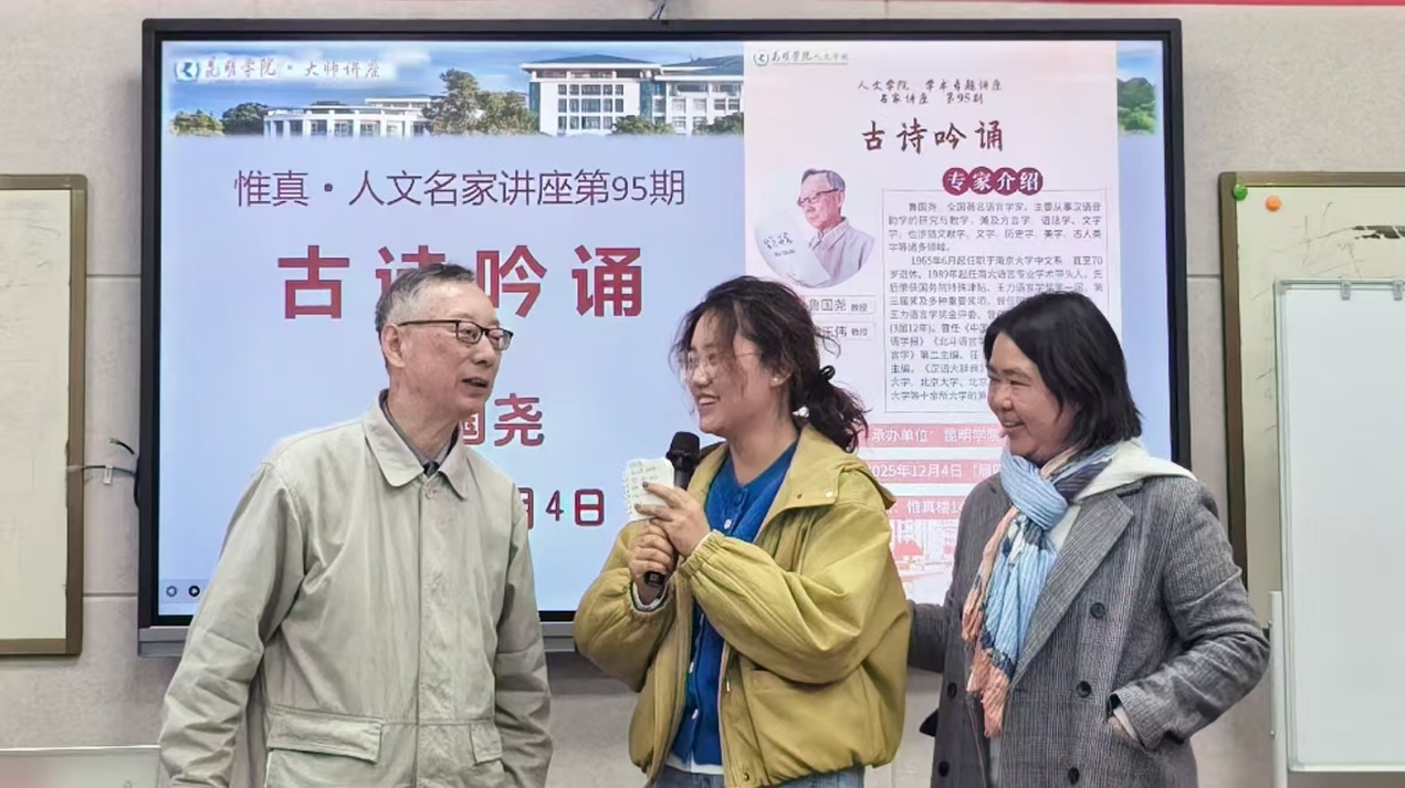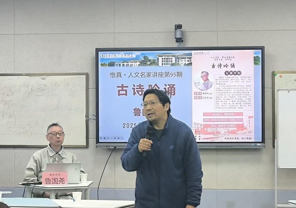 2025年12月4日早上9点30分,第95期 “惟真·人文名家讲座”在惟真楼1402开讲,主讲人为全国著名语言学专家鲁国尧先生,主题为“古诗吟诵”,主持人为人文学院副院长田玉玲教授。