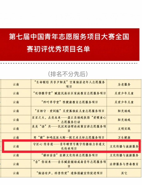 近日,昆明学院人文学院“青年瞭望号”工作室项目在第七届中国青年志愿服务大赛云南赛区决赛中表现突出,荣获省级银奖。该项目凭借在非物质文化遗产传播与保护方面的创新实践,不仅赢得了省内评委的高度认可,更被共青团中央、中央社会工作部、民政部等部门认定为中国青年志愿服务项目全国优秀项目,成为云南省在文化传播与旅游服务项目类别中唯一获此殊荣的高校队伍。