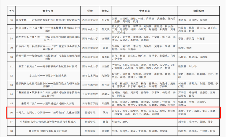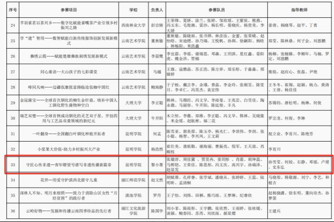 为贯彻落实党的二十大精神,教育部于2024年4月至10月举办中国国际大学生创新大赛(2024)。昆明学院人文学院积极响应号召,踊跃参与比赛,取得一金、两银、一铜的好成绩。其中孙雪莹老师团队指导的“守匠心传非遗—青年瞭望号谱写非遗传播新篇章”项目获得省赛金奖,李歆老师团队指导的“寻找身边的‘大洋芋’—以院线电影助力乡村振兴”项目和“书同文、文同心、心同语—‘云岭红韵’文化宣讲团”项目分别获得省赛银奖和铜奖,骆霄老师团队指导的“汉镜MR——科研融合的推广大师”项目获得省赛银奖。这些成果展现了人文学院师生在创新创业领域的卓越实力,有利于推动形成高校毕业生更高质量创业就业的新局面。
