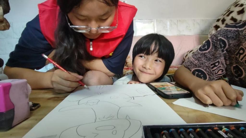 在家访过程中,团队成员与孩子们一起朗读课文,纠正他们的普通话发音,对他们学习中遇到的问题进行指导。还与他们进行了绕口令、成语接龙、朗诵诗词等小游戏,让孩子们在欢声笑语中,体会到语言的魅力。为了拉近与孩子们之间的距离,队员们还和他们一起画画,随着一幅幅简笔画的完成,团队成员明显感受到与孩子们的心更近了。团队还给孩子们带去了书籍和文具,鼓励他们勇敢追求知识,告诉他们外面的世界很精彩,希望他们健康成长,努力实现自己的梦想。