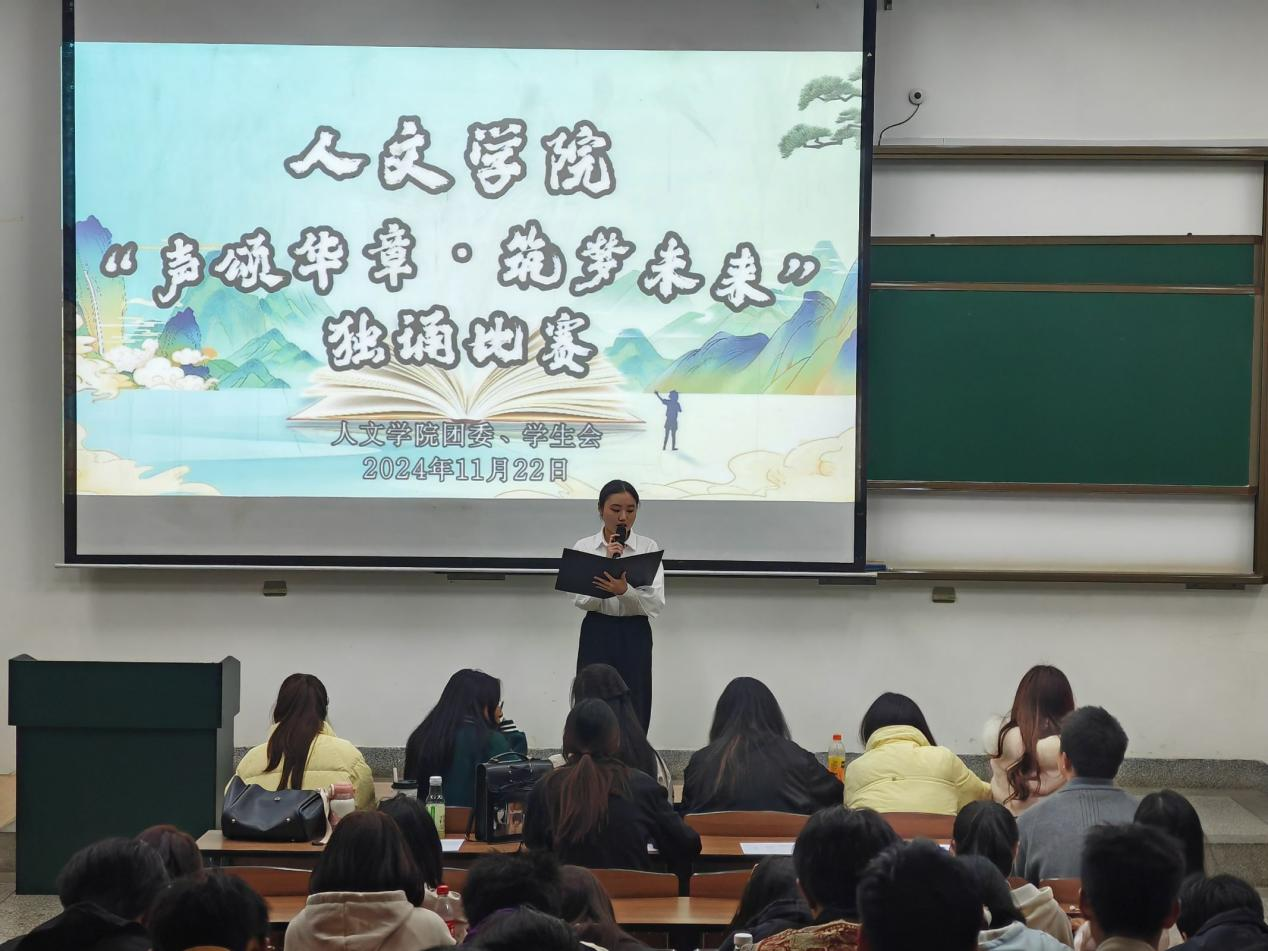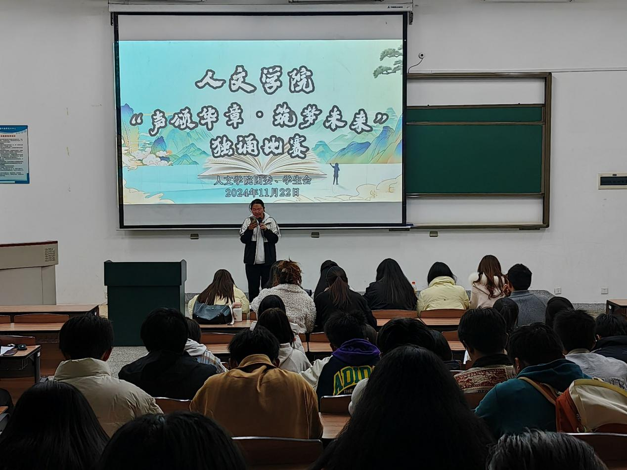 为了加深学生们对中华文化的理解,增强民族自豪感,提升语言表达能力,人文学院于2024年11月22日晚在博雅楼3201教室举行了“声颂华章,筑梦未来”独诵比赛。本次比赛以经典文学作品为基石,选手们用真挚的情感和优美的嗓音,唤醒了文字的生命力,让现场观众沉浸于文学与朗诵艺术交融的海洋。