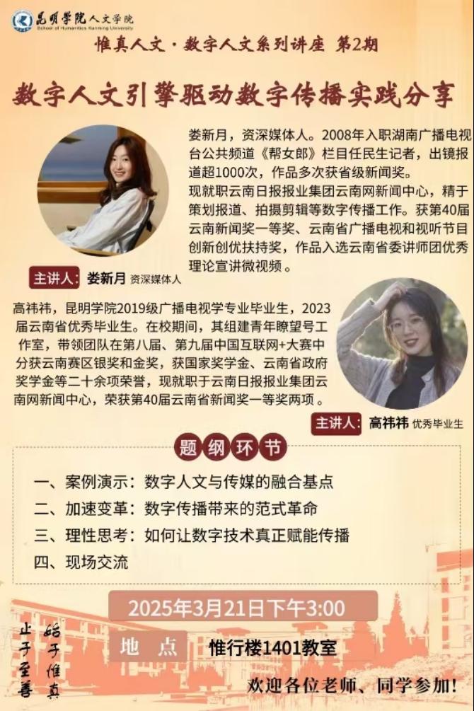 3月21日下午3点,昆明学院人文学院“惟真人文·数字人文系列讲座第2期——数字人文引擎驱动数字传播实践分享”在惟行楼1401教室顺利举行。资深媒体人娄新月与学院优秀毕业生高祎祎担任主讲人,吸引了众多师生参与。