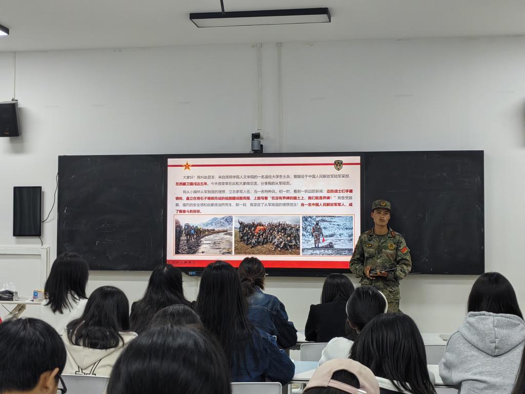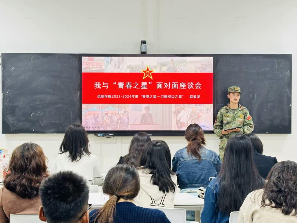 为深入挖掘和宣传典型榜样,发挥朋辈引导互助作用,构建学生成长共同体,人文学院团委、学生会于2024年10月20日在惟真楼1402举办“我与青春之星面对面”座谈会。此次座谈会邀请到昆明学院2023~2024年度“青春之星——卫国戍边之星”获得者人文学院赵显发与同学们进行交流分享。